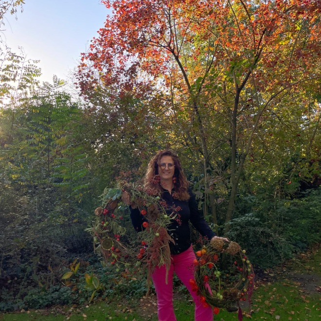 Unter der begeisterten Anleitung einer Blumenstylistin lernen Sie, wie man einen Kranz aus Ranken bindet und ihn mit Blumen aus unserem Pflückgarten schmückt, ergänzt durch Beeren, Herbstfrüchte und andere schöne saisonale Materialien.